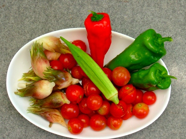 今朝雑草とトレニアに覆われた我が家の畑から収穫した(可愛い)野菜たちです。ミニトマト・オクラ(1個だけ)・ピーマン・茗荷です。