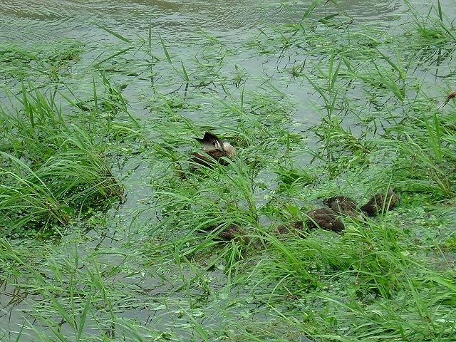 いつもは日向ぼっこしている川の草もすっかり水没していますが、大きくなった子どもたちを連れたカモ家族9羽がその草に顔を突っ込んで何やら啄んでいました。