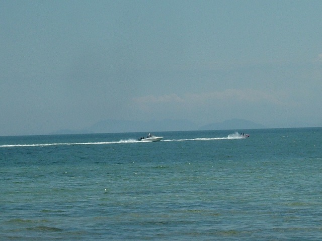 やや沖の方にモーターボートとジェットスキーがワオワオと粋がって走っています。泳いでいる時にこれが来ると危ないのよね。