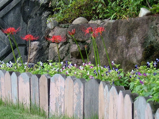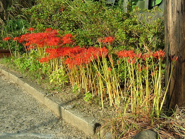 風が吹いて折角咲き始めた曼珠沙華が折れてしまうかも・・・と、私が球根を埋め込んだ子どもたちの記念写真を撮っておきました。