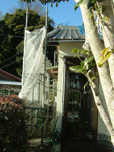 数日前から外壁の塗装工事が始まりました。足場を組んでがんじがらめにな った後2日間は雨で、やっと下塗りが開始したところです。私の定位置のkitchenから空模様を観るのが常ですが、幕で覆われてそれが叶わなくなりました。