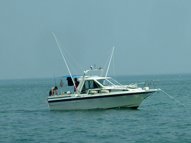 岸から左程遠くないところにクルーザーを停めて「これみよがしに」遊んでいる「わ(ば)かもの集団」がいました。そんなことをしてみたい愚かな年頃は誰にでもあるものですが・・・。