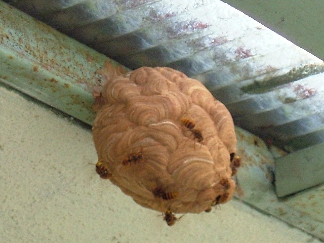 現在留守宅になっている隣家には、毎日風を入れに出入りしていますが、その時に利用しているお勝手口の直ぐ上に(いつの間にやら)スズメバチが巣を製作中です。普段頭上を見ないので、こんなに大きくなるまで家人の誰も気付きませんでした。写真を撮られているのも気付かないのか、無関心なのか、動じることなくセッセセッセと巣を大きくするのに夢中です。どの位まで大きくするする積りなのか、過程を観察してみたい気もしますが・・。危険ですよね。
