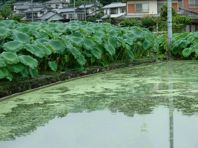 反対側の(何も植えていない)田圃には藻がびっしりで緑のカーッペットを敷いたようです。