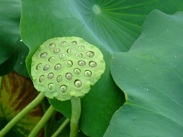 暑い間目を楽しませてくれたレンコンの花が、今ではほとんど散ってしまいました。その後にできるのがこの「ハスの実」です。穴の中の実を取り出して皮を剥くと食べられますが、「食べても大丈夫」というだけで決して美味しいものではありません。