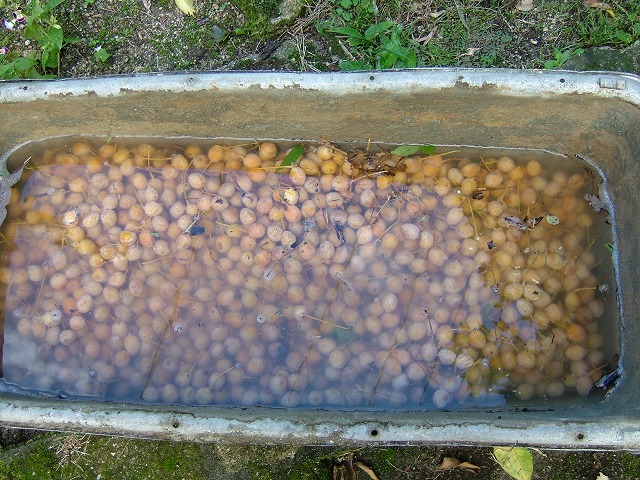 こんなに沢山持ち帰ってきました。ご近所に聞いてもあまり歓迎されず、ほんの少ししか貰ってもらえませんでした。仕方なく取りあえずこうしてでっかい桶に入れて水攻めにしています。銀杏は素手で扱うと「かぶれるよ」と言われているので本当に厄介です。