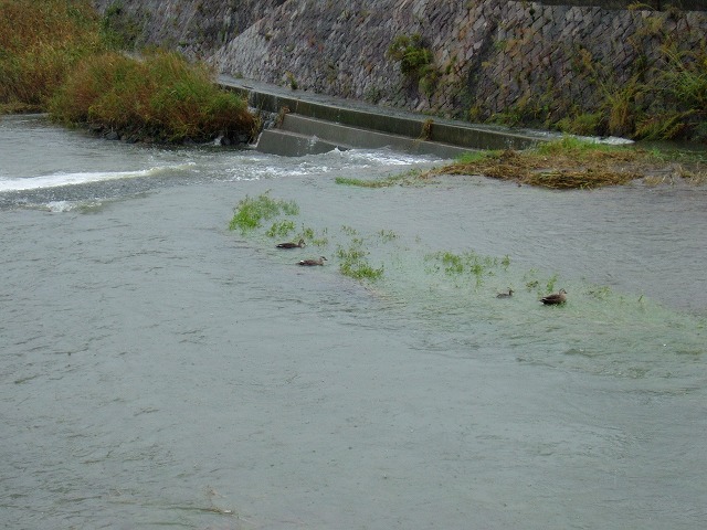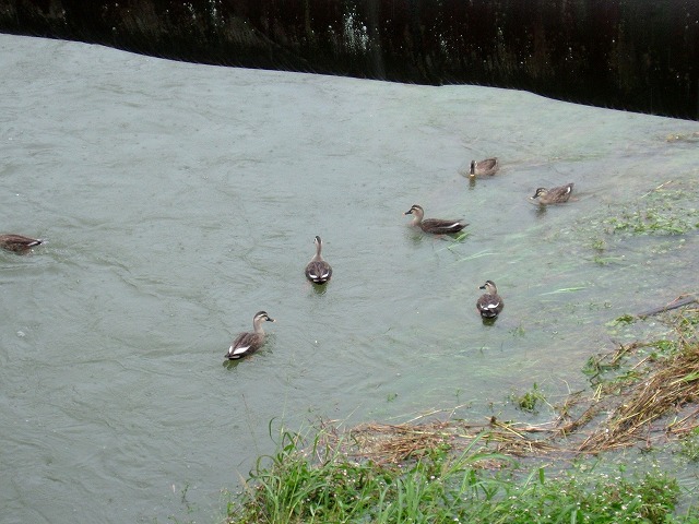 どうしてもの用事があり、雨の中を長靴を履いて出かけました。増水した通津川でカモたちは楽しそうに遊んでいて、しばらく濡れながら眺めていました。だいぶ大きくなった子どもたちは、急な流れにツ~ツ~とわざと堰まで流され、「アッ!落ちちゃう!」と思うギリギリまで行くとパーと飛んで又上流から流れるのです。凄く楽しそうで見ていて飽きません。