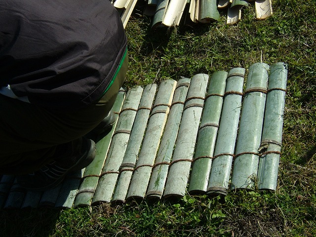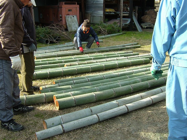 きれいにカットした竹と、桶の周りに巻く竹のスダレを編んでいるところです。スダレは180㌢の物を6枚編みます。私はフラフラと見ているしか能がありませんが、「たいへんだなー」と思いつつも、1年1回の作業で忘れていることを笑いながら互いに協力して仕上げていく会員を素晴らしいと感じています。