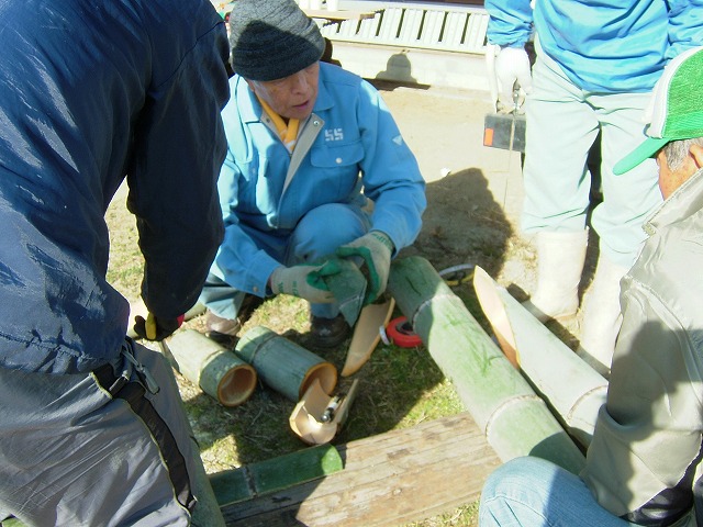 ここ数年間NPOでは、市内の老健施設からの依頼を受けて「門松」を造っています。3ヶ所分6基の作製に今日取り掛かりました。先ず孟宗竹や松・南天・梅などの材料を集めます。どの竹とどの竹を3本組にするのかを決めて、一番肝心な上に難しい「ななめカット」をします。