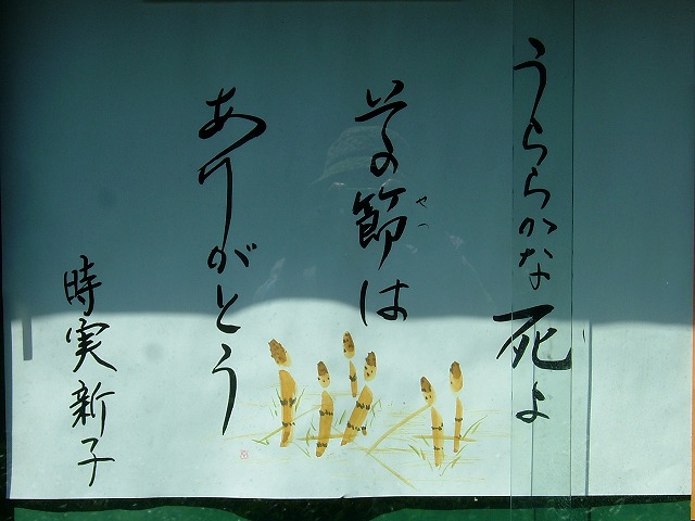 今日お寺の前を通り、改めて掲示板を見、大変な勘違いに気付きました。「うららかな 花よ・・」と思ったのは「うららかな死よ その節は ありがとう」でした。「花」と「死」では違いすぎです。時実さんがどのような亡くなり方をされたのかは知りませんが、彼女が好きになりました。こんな風な言葉を残して死ねるなんて最高です。