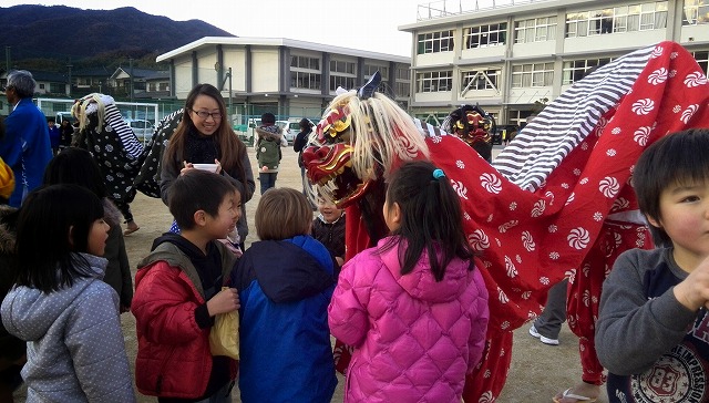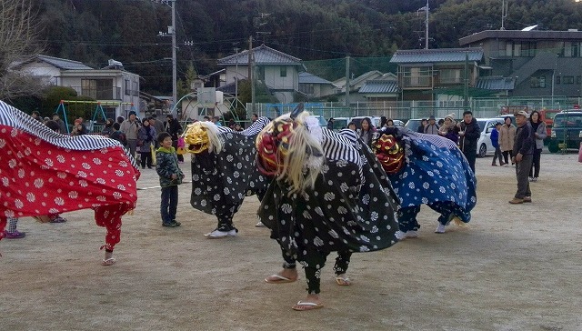 舞い終えた獅子たちに子どもたちが群がって「噛んで!噛んで!」と嬉しそうです。ここでは例年、お餅が入ったぜんざいが振る舞われていて「こんなに人がいるのね」と感心する位の行列ができています。「行列嫌い」で「待ってまで食べたくない」私は一度も味わった事がありません。
