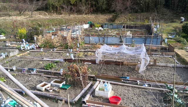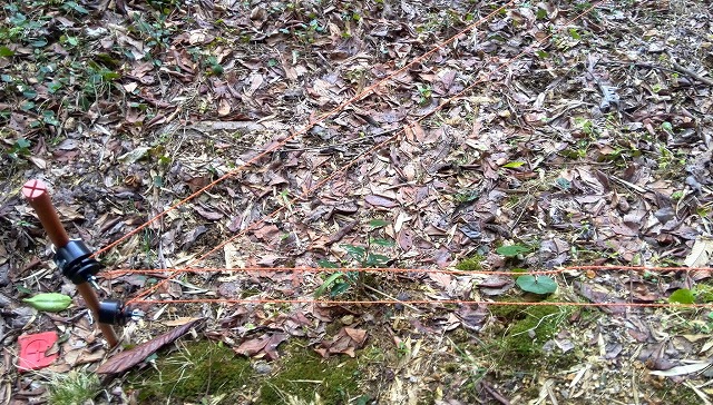 今は作物がありませんが、コツコツと(誰かが)作っている畑です。小さな区画は「市民農園」風ですが、実はイノシシ避けの柵です。腰より低い板やトタン板など古材をフル活用して設けてありますが、イノシシは軽々と飛び越えるとの説もあります。右の写真はやはりイニシシ避けの「電線(?)」です。彼らが触れると