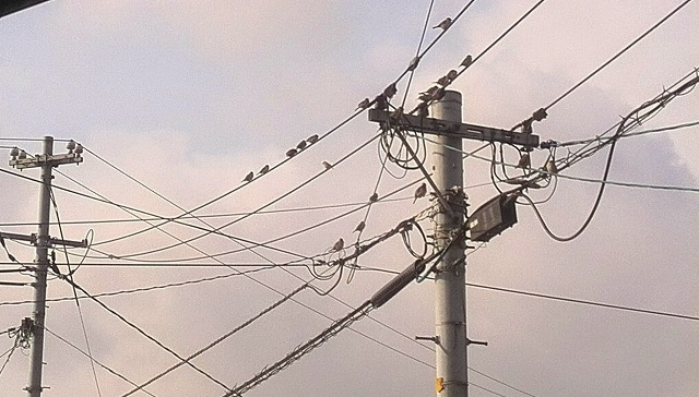 朝、うかうかしているとエサ台の上の電線がご覧の通りです。「行列ができるレストラン」とはこの事です。