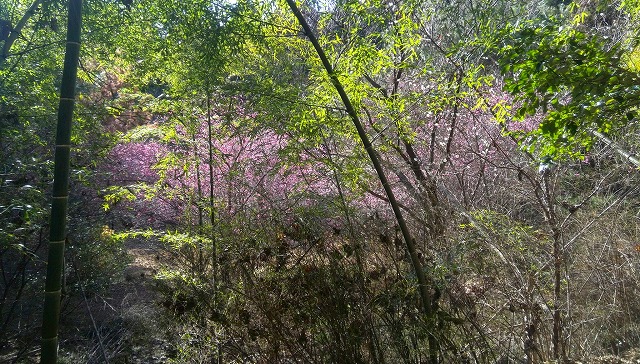 竹に覆われた空間に咲いている紅梅。あと数年すると「竹にやられて枯れるよ」とは同行者の弁。