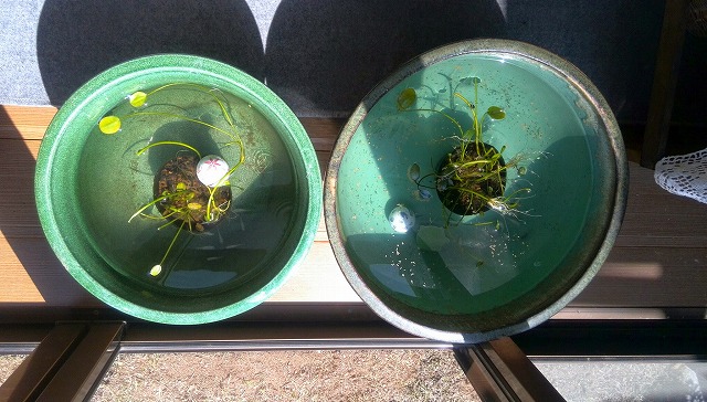 良いお天気なので気に懸っていた事に取り掛かりました。大きな水盤2個にメダカが生きているはずです。寒くなってからエサも一切やらず冬眠させていましたが、サンルームに置いているためか2個とも緑色の藻に覆われてしまいました。覗いてみても中は全く見えずメダカたちの消息も不明です。自慢だった(?)腕力もこの頃はめっきり衰えて水盤を外へ持ち出すのも一苦労です。時間をかけて掃除をした結果