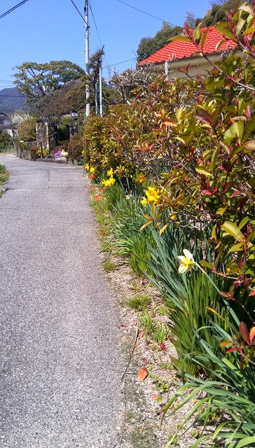 我が家前の細道。右手には沢山のラッパ水仙が咲いています。