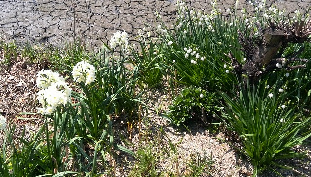 小道の左側の小さなスペースには白い八重水仙とスノードロップ。