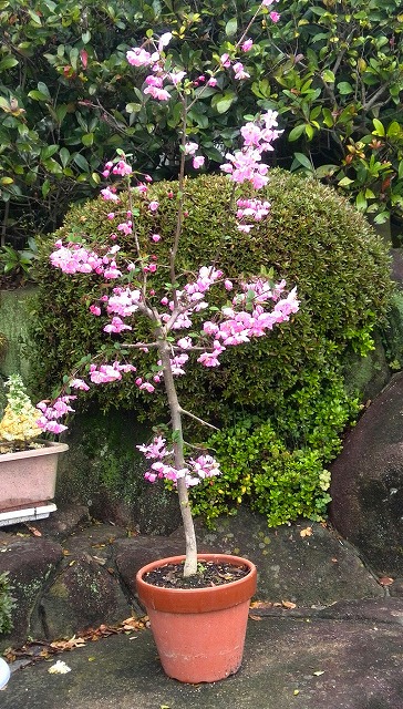 丁度一年前に買った「花海棠(はなかいどう)」です。一回り大きくなって今年も可愛く咲きました。何十年も前から大好きな花です。右の写真はアップです。