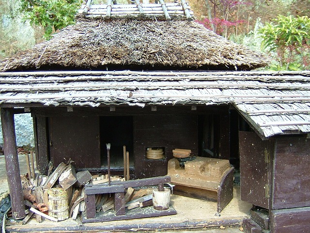このミニチュアハウスには「足踏み式の臼(?)」や「竈」「竹のザル」などが見事に再現されています。