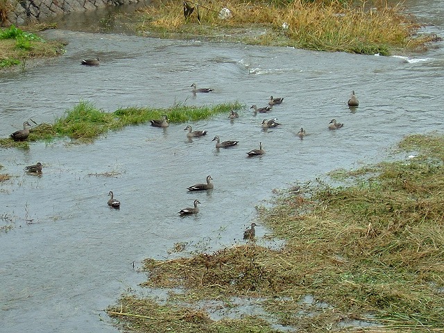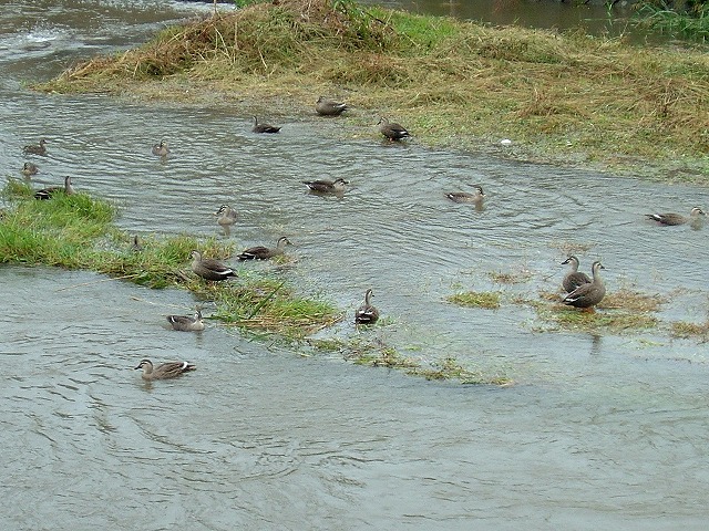 ちょっと小降りになった隙にポストまで行き、(濁った)水で増水した川でカモたちが遊んでいるのに会いました。その数30羽?いやそれ以上です。「雨なのにバカね・・」と言いながら、いつまでも傘をさして眺めている私の方が若しかして・・・・・?