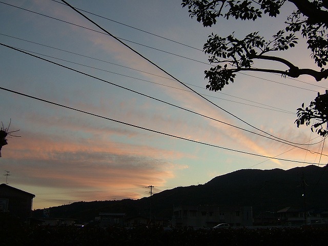 夕方5時の西の空です。「つるべおとし」の陽が山の端に去った後の言いようもないきれいな夕焼けです。左の写真で山頂にアンテナが見えているのが先日登った「高照寺山」です。