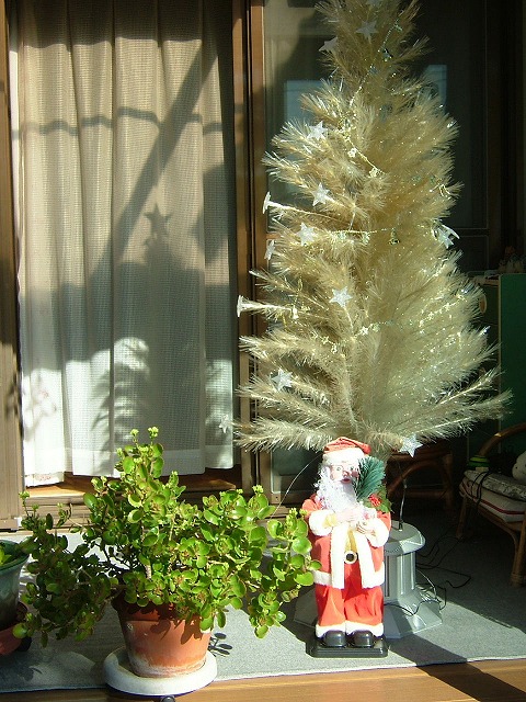 節電のために屋外のイルミネーションは震災以来止めていますが、ツリーとサンタは出しました。暗くなってから5時間くらい点灯します。