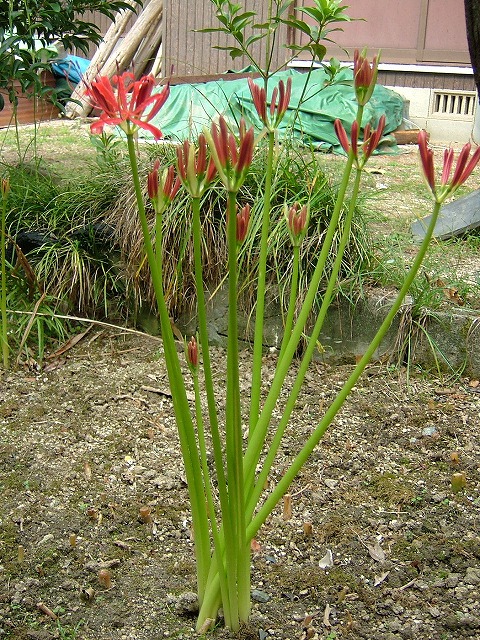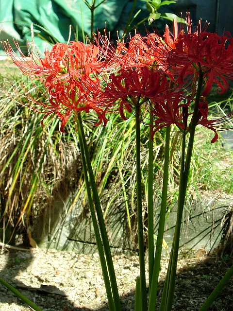 一昨日右の写真のようだった曼珠沙華が今日は左側の写真です。この花は一日に5㌢伸びると言われていて、芽が出るとあっという間に咲いて終わってしまいます。