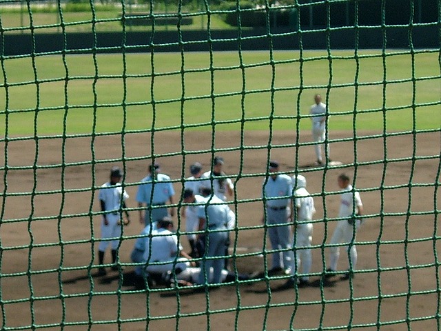 ところが1回裏の岩国の攻撃で福井君(サード)が強烈なピッチャー返しを打ち、熊毛の東君の顔面を直撃。彼はバッタリ倒れました。その様子では救急車が必要かと思われましたが、担架で運ばれた彼は「治療中のためにしばらくお待ちください」のアナウンスの後不死鳥のごとく再びマウンドに立ちました。