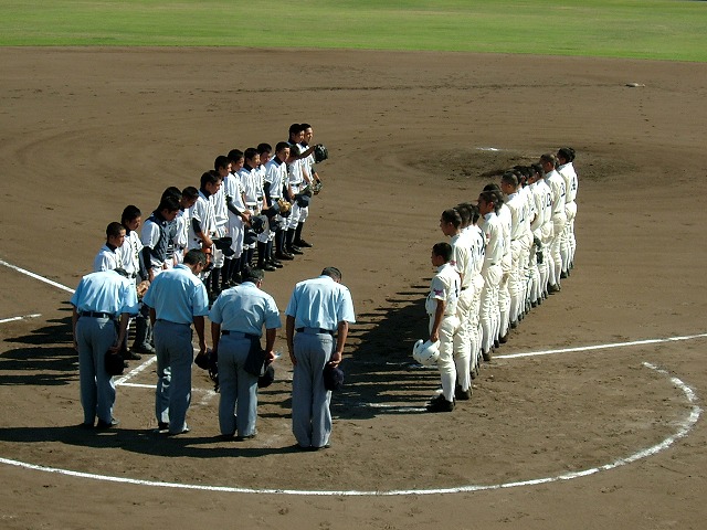 午前の試合(大島高校:柳井学園で柳井学園の勝ち)が少し長引いたために、予定より30分遅れての試合開始。まだきれいなユニフォームで「よろしくおねがいします」。