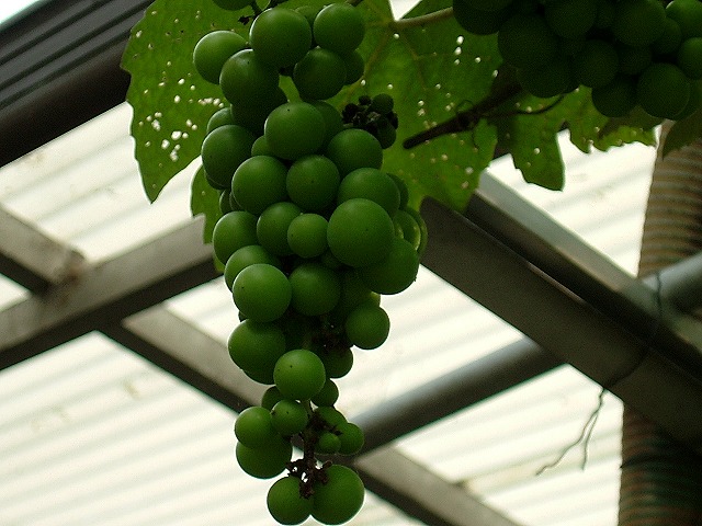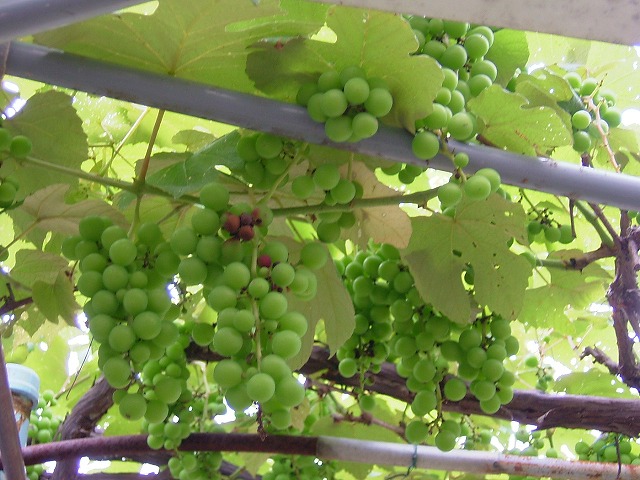 先住者が植えた古いブドウの木に今年も実が付きました。タタミ3枚分くらいの小さな空間ですが、夏の太陽から日射しを遮ってくれる貴重な場所です。私も家族もブドウを好んで食べることはありませんが、友人やその家族に「自然の酸っぱさがスキ」と言う方もあるので一応収穫までします。
