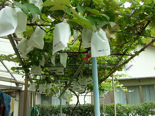 収穫するからには少しでも良いものを・・・と袋かけをしました。この作業は脚立に上がって、ずっと上を向いているので首が痛くなるし、めまいがするしで大変です。今年は息子が手伝ってくれました。まだ半分近く残っていますが「もうやりたくない!」