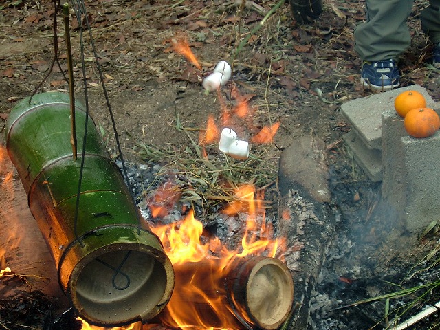 焚火の自在かぎに下がっている竹の中には「炊き込みご飯」が沸騰中。白く見えるのは竹の棒に刺したマシュマロです。子どもたちは大好きでいっぱい持ってきます。火の下には秋に収穫したサツマイモがアルミホイルに包まれて転がっています。