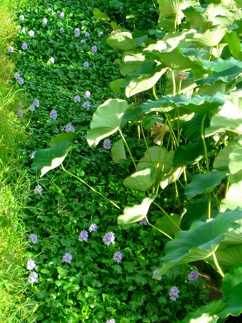 メダカの鉢で布袋草の花が咲いた!と楽しんでいますが、ふと気付くといつも通るハス田の畔にビッシリと咲いていました。短命な花ですが上品な色合いがとても素敵な花です。(拡大して観てください)