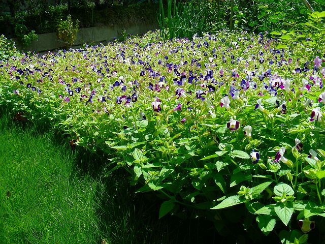 畑を覆っているトレニアです。この花が大好きで咲かせている身としては満足ですが、家人にはただの「邪魔者」以外の何者でもないようです。実際にトレニアに取り囲まれてしまったミニトマトが赤くなっていても、花を踏みつけないと収穫できない有様です。私には「トマトよりトレニア」です。