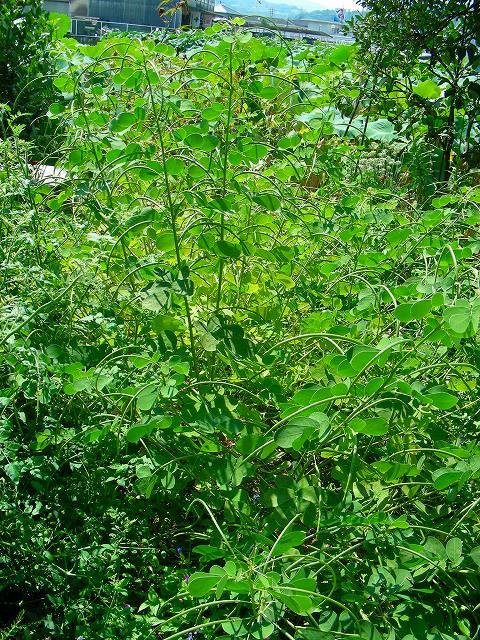 トレニアに囲まれてどうしようもなくなっているのは「ミニトマト」だけではなく、この「はぶ草(豆茶)」もそうです。もう少し色づいたら収穫なのですが・・。我が家では一年中はぶ草茶を飲んでいます。