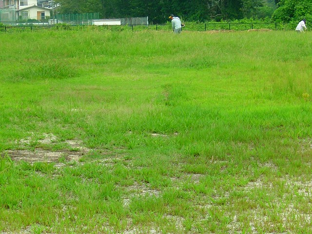 奥に見える大きな建物は通津の小高い所にある有料老健施設です。先日盆踊りがあった施設とは別で、人口5000人足らずのところに2ヶ所も施設がある訳です。都会に比べれば安価なのですが、私の年金では到底入所できません。とまあ・・そんな愚痴は止めます。手前の広場はこの施設を建てる時にオーナーが買い取ったスペースですが、ずっと草ボウボウに放置されていました。地区の老人会がグラウンドゴルフをするために無償で借り受け、その代わり草を刈るなどの管理をします。お互いにとってなかなか良いアイディアでした。今日は直ぐに伸びてコースを覆ってしまう草を刈って、それが済んだらゴルフでもう一汗です。私はやりませんと言うよりやれません。