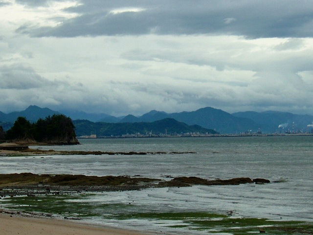朝6時半過ぎの西の空と潮が引いている海です。雲は重く覆っていますが、雨・風はなく生ぬるい空気でした。