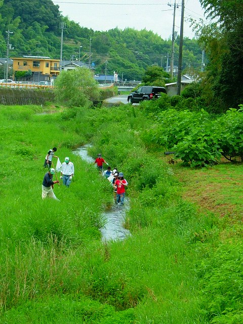 「海の日に川のおそうじ」実施の日ですが、朝からの雨。それほどの雨ではないのでとにかく8時半に集合場所に行くと、早くも火がたかれメンバーはやる気満々です。主催者とも相談し「様子を見ながらやりましょう」と決定。川で子ども達を見守りながら一緒にゴミを拾う係りと、おにぎり用のご飯を炊き(何と!お釜で炊いておこげを作るのです)、そうめん流しの準備をする係りに分かれます。
