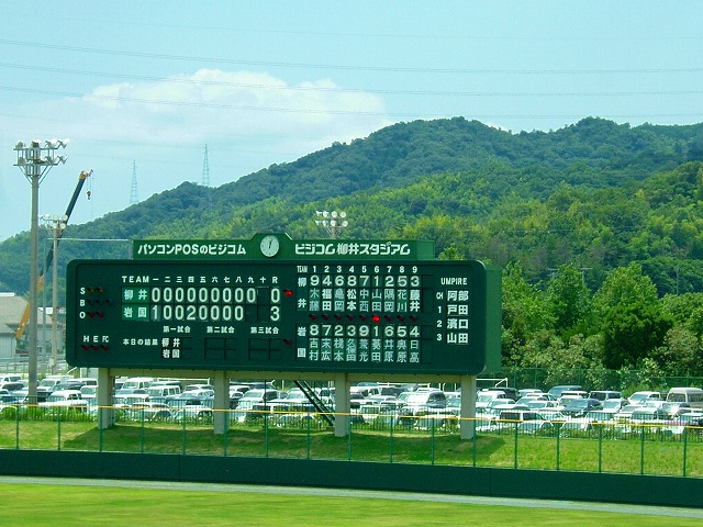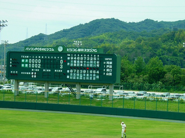 「第93回全国高校野球選手権・山口大会」:柳井球場での第1試合を応援するために8時前に家を出ました。主婦らしい事を何もせずとも、この時間に出かけるのは大変です。しかも天気予報を裏切ってカンカン照り。台風の影響で延期になったお陰で夏休みに入り、岩国高校も相手校(熊毛南)も生徒が大勢応援に来ていました。試合結果は10×:6で岩国が勝ちました。が、暑さのためばかりでなくとても疲れる試合でした。双方とも(今日に限ってかどうか)投手が良くなく、打ったり打たれたりの大混戦。早々に負けた秋季大会に出られなかったエース・菱田君が投げるので期待しましたが、カウントを悪くしては打たれるの繰り返し。「アホタン!」と言ってやりたいけれど、周りに選手の家族が大勢いてうっかりしたことは言えません。スタメンと控えに灘中出身の選手が7人もいます。捕手の梯本(かきもと)君も灘ですが、彼は良く捕り良く打ちました。残念ながらカメラを忘れて写真がありません。明日をお楽しみに。明日は10時から柳井高校との対戦です。