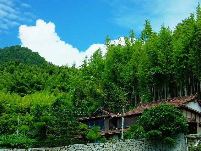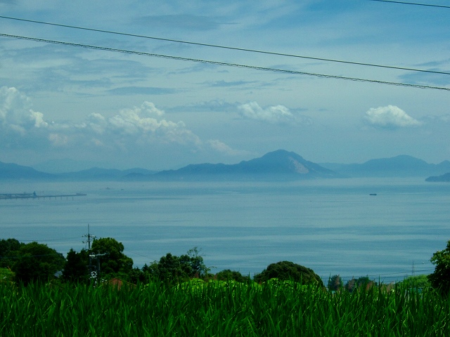 山の上の家と夏雲。はるかに見える瀬戸内海。