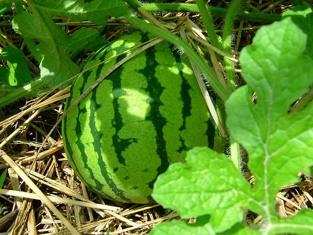 師匠の畑には直径15㌢くらいのスイカがなっています。