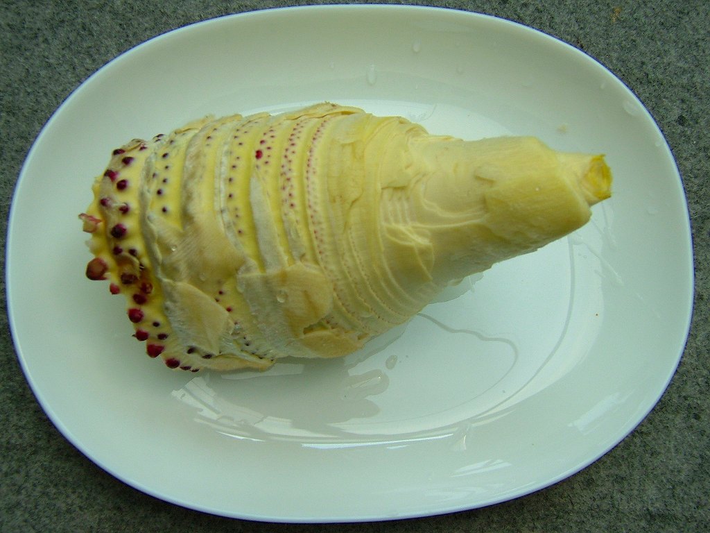 昨年の日記を参考に、4~5日前連れ合いとタケノコの様子を見るため裏山に行きました。昨年のこの時期には、既に人が掘った穴が幾つかあいており、私たちも何本か持ち帰りました。ところがその日には1本もなく残念なような安心のような気持ちで下山しました。次々生えてくるタケノコは美味しいとともに、ちゃんと管理しないとあっと言う間にタケノコはタケになって、山が荒れてしまうとの悩みの種でもあるからです。先日雨が降ったので、「一度山を見て置くように」と言い残して連れ合いは上京しました。今日、息子と上ってみるとただ単に季節が遅れているのではなく、何か異常事態が発生していると感じました。10~20㌢くらい顔を出しているタケノコが「立ち枯れ」しています。10本以上の立ち枯れタケノコで諦めかけたときに、たった1本だけ生きたタケノコに遭遇しました。