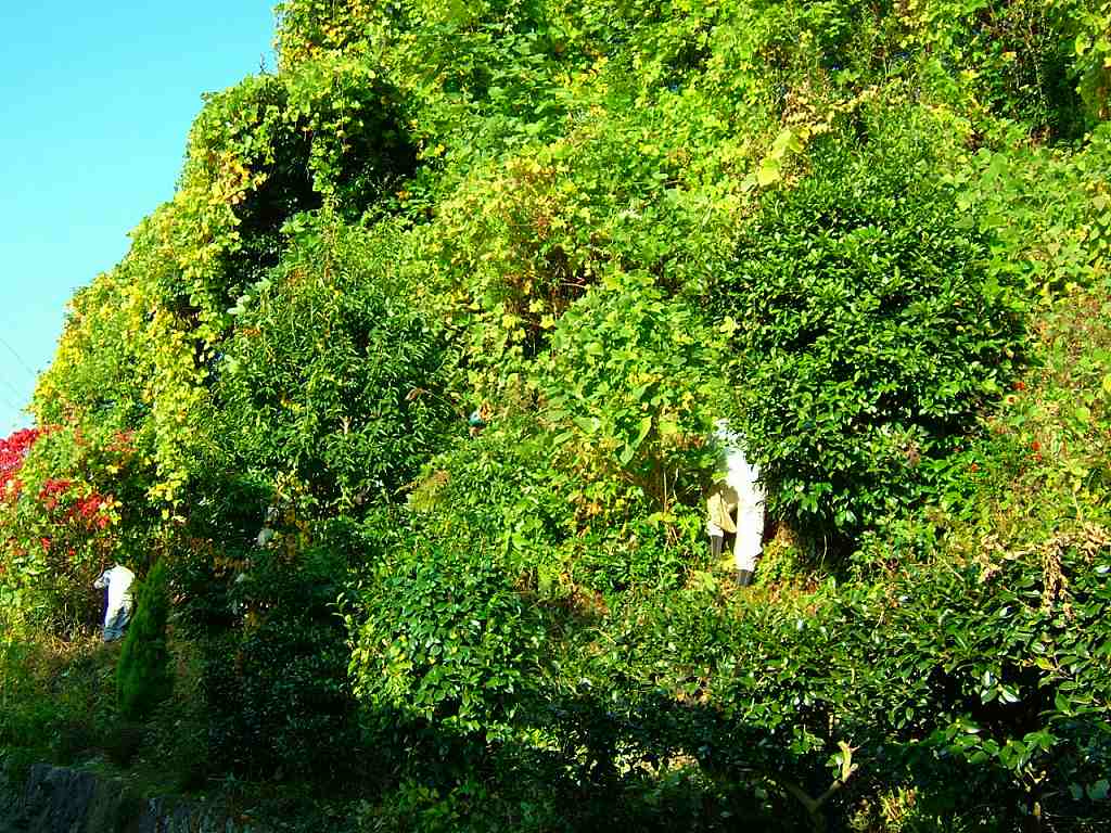 原則第1・第3土曜日を活動日にしているNPOで、今日はお金を頂く作業にかかりました。民家の裏山の整備ですが、これが結構な急斜面の上、長年放ってあったために雑木が大きく育ち、それにクズの蔓がマンモスのように盛り上がって巻きついています。普段でも役立たずの私ですが、加えて腰痛中のためにただ「怪我がないように・・」と祈りながら口をアホのように開けて観ているだけです。作業をしている会員は汗を(暑さと冷や汗と)かいて大変なのですが、観ているのは(申し訳ないほど)面白いのです。