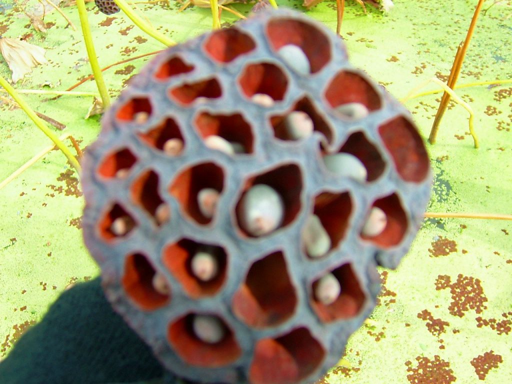 立ち枯れたハス台で、穴に入ってるのが実です。花が落ちた後にハス台ができ、まだ緑色をしている時には実を取り出して食べたりしますが青臭い味で美味しいとは言えません。写真のようになった物は花材として珍重されるようです。