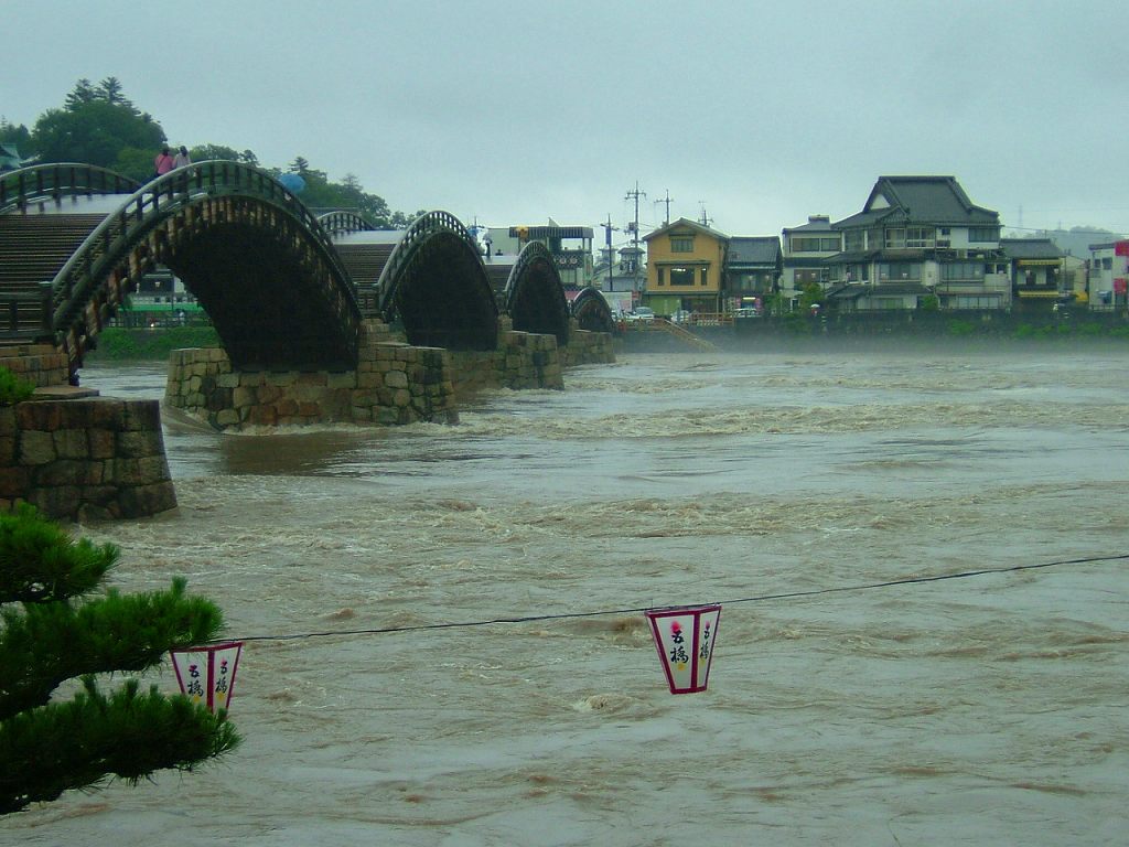 我が家もいつ裏山が落ちてくるか・・目の前の通津川が氾濫するか・・と心配しているのですが。心のどこかで「大丈夫」と思っているのでしょうね。山が落ちてくるのを待っている訳にもいかず、雨の中、連れ合いと錦帯橋の様子を見に行って来ました。驚いた事に私同様傘をさしながら写真を撮っている人が結構いました。