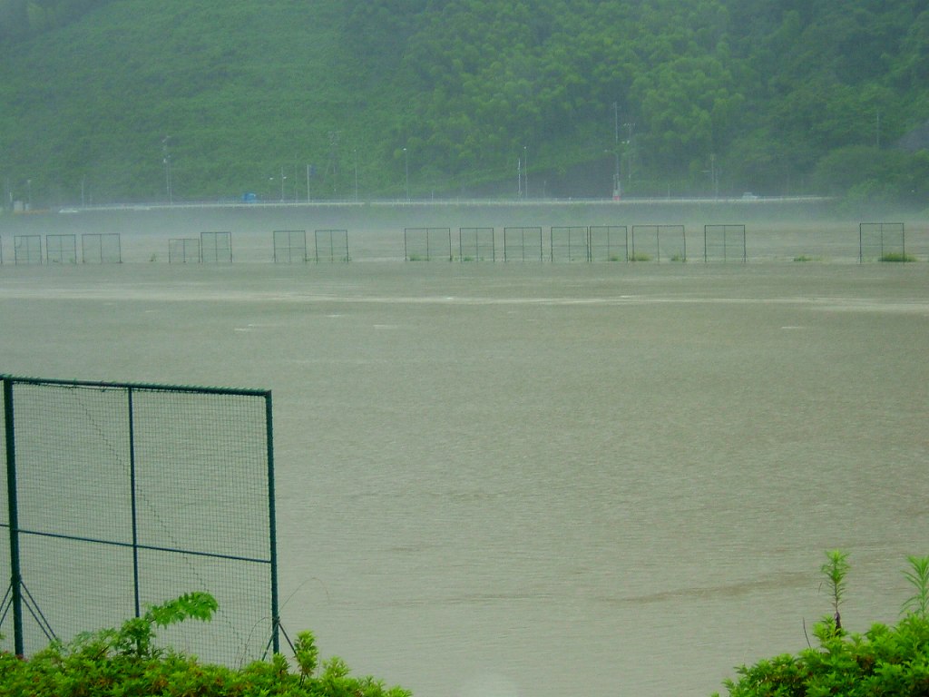 子ども達が野球やサッカーの試合をする堰堤のグラウンドにはゴールポストが水から生えているかのようです。