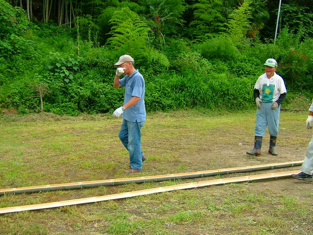 明日の子ども会支援で「そうめん流し」をしようとNPOが作業しました。先ず、大きな竹を切り倒し、縦に真っぷたつに割りました。「竹を割ったような・・」と言われるのが良く解る割れっ振りでした。
