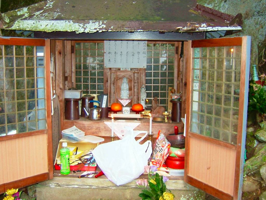 愛らしく素朴な祠と直ぐ横にある滝。今年は水量が多く、昔、山を越えてきた修験者がここで滝に打たれたというのも納得できます。