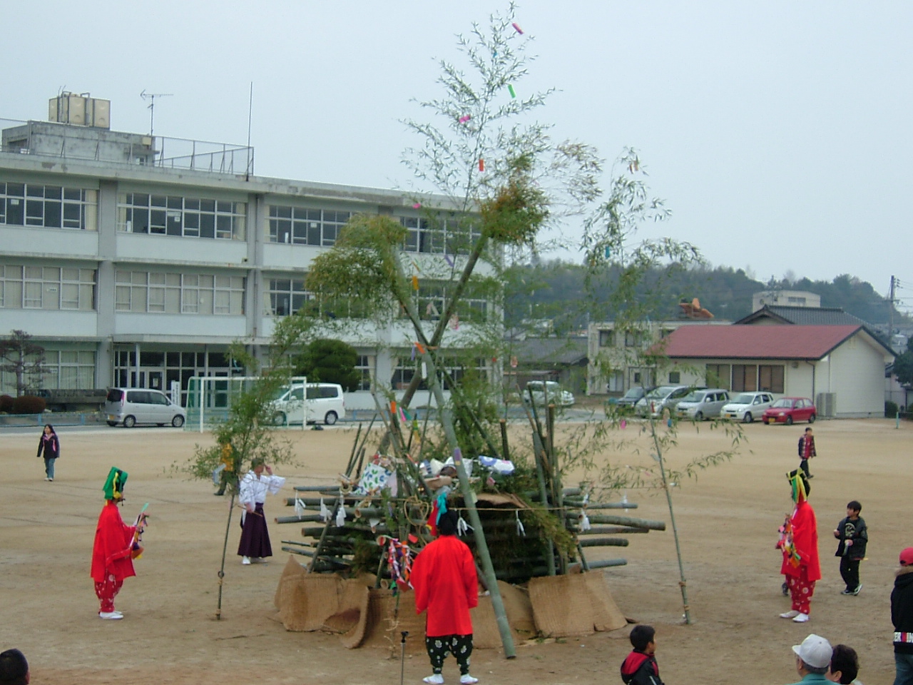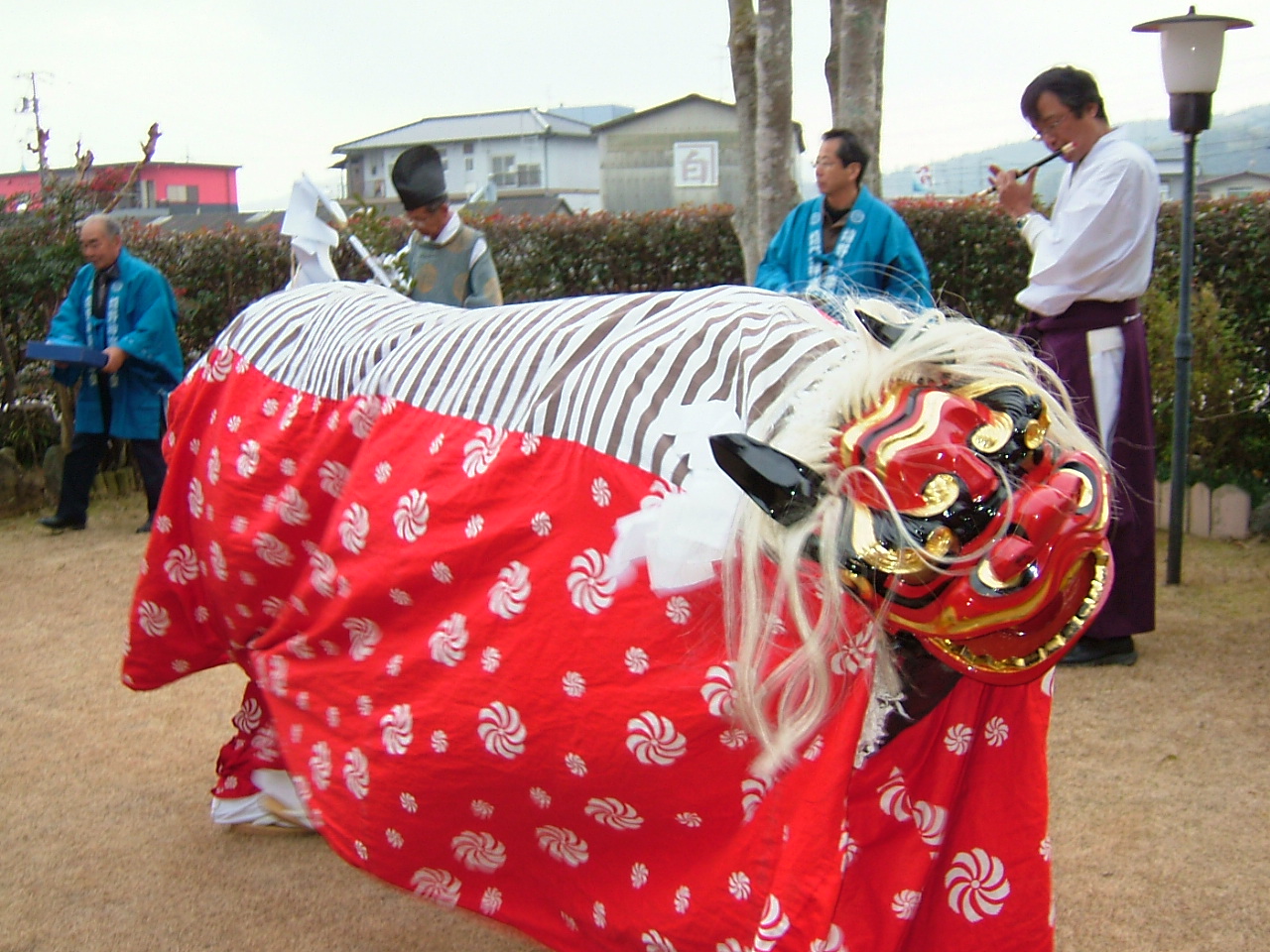 午後3時過ぎに「福獅子」が回ってきました。通津の「伝統芸能保存会」が主催するお正月恒例の巡回です。男子高校生が入った2頭の赤い獅子が庭先で舞ってくれ、最後に頭を噛んでくれました。考えてみれば、頭はこれ以上どうしようもないので、今年は治療中の足を噛んで貰った方が良かったかしら。その後4時過ぎから小学校の校庭で「とんど祭り」があり、向こう三軒の松飾を預かって出かけました。まだ明るさが残る空に燃え上がる炎を背景に、ここでも4頭の獅子が舞いました。難しい年頃の中・高生が辛い中腰で汗をかいて獅子になっているのは嬉しい事です。