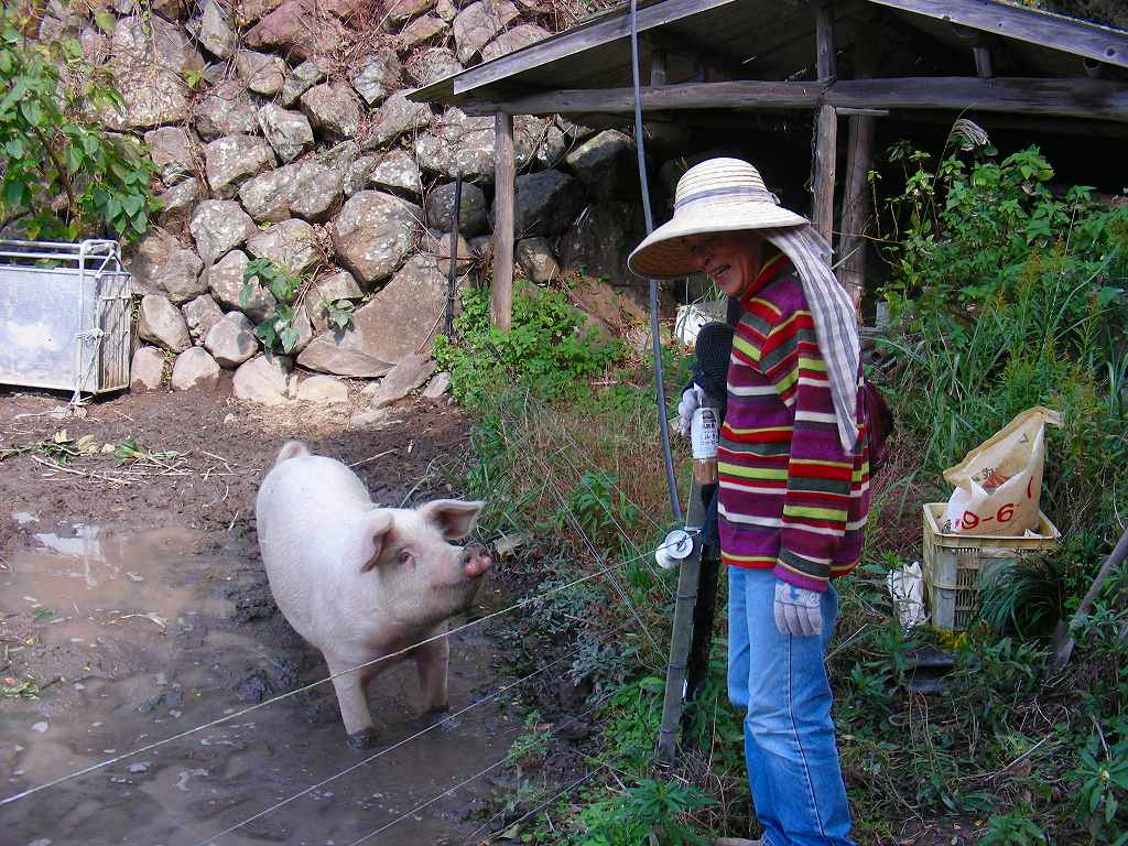 数年前に島を活性化したいとUターン帰島して豚を放牧している人があるとのニュースを観ていたので、探してみました。山の中腹に豚たちはいました。今年生まれの子豚11匹は先日の雨でぬかるんだ荒地で粘土遊びをしていました。人恋しいのか空腹なのか、私達を見つけるとキ~キ~言いながら一斉に走りよって来る様は、カワイー!荒れた休耕田に放された豚は雑草を食べながら糞をし、歩き回って耕し立派な畑に作り直してくれるようです。豚の飼い主は不在らしく、勝手に豚に会ってきましたが、親豚も子豚も電気が通った線に囲まれていました。「何だか悲しいね」と息子と話しましたが、あの電線は外敵から豚を守るための物かも知れません。